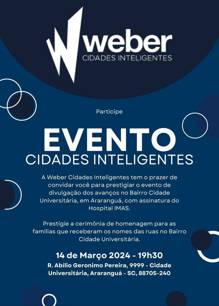 Nesta quinta-feira (14), 19h30, o empresário Fernando Weber irá receber a diretoria do Instituto Maria Schmitt para fechamento de uma parceria para construção de uma unidade de saúde no bairro universitário, no projeto Cidades Inteligentes Weber. Além de uma prestação de contas dos investimentos no projeto, também serão homenageadas famílias de pessoas que receberam nomes nas ruas do bairro.