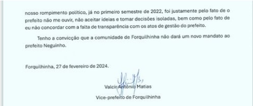 “Em nome do Governo de Forquilhinha, o prefeito José Cláudio Gonçalves, esclarece que assim que informado sobre a “Operação Maktub” realizada na manhã desta terça-feira, dia 27, no Paço Municipal, colocou todos os membros da administração municipal à disposição das autoridades para que seja feita a justiça, reforçando o compromisso com a transparência por parte da atual gestão. Governo de Forquilhinha”.