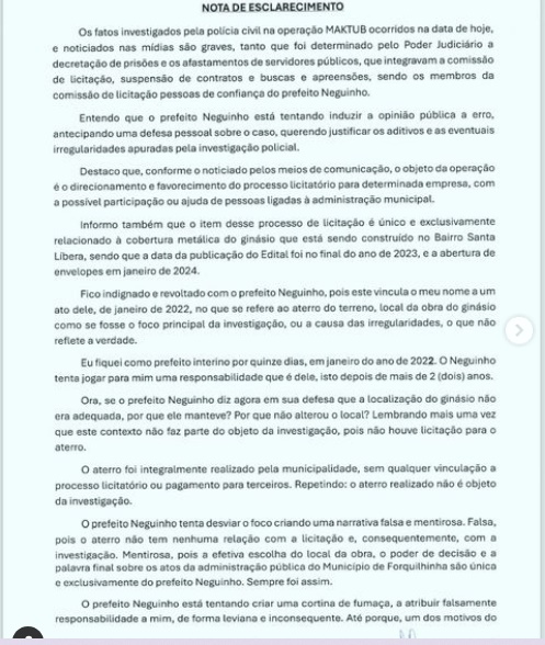 “Em nome do Governo de Forquilhinha, o prefeito José Cláudio Gonçalves, esclarece que assim que informado sobre a “Operação Maktub” realizada na manhã desta terça-feira, dia 27, no Paço Municipal, colocou todos os membros da administração municipal à disposição das autoridades para que seja feita a justiça, reforçando o compromisso com a transparência por parte da atual gestão. Governo de Forquilhinha”.