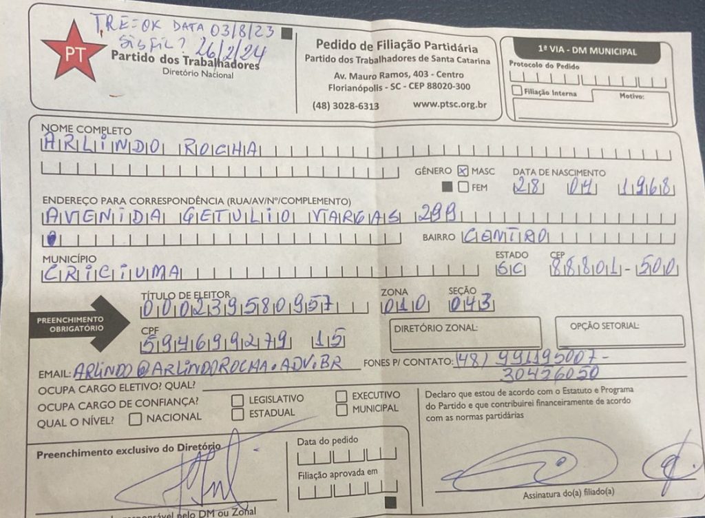 O ex prefeito de Maracajá, Arlindo Rocha, o Lale (PT), conseguiu aquilo que havia colocado como meta para entrar no Partido dos Trabalhadores de Criciúma. O aval do ex presidente Lula da Silva (PT) e do vice Geraldo Alckmin (PSB) aconteceu na capital federal.