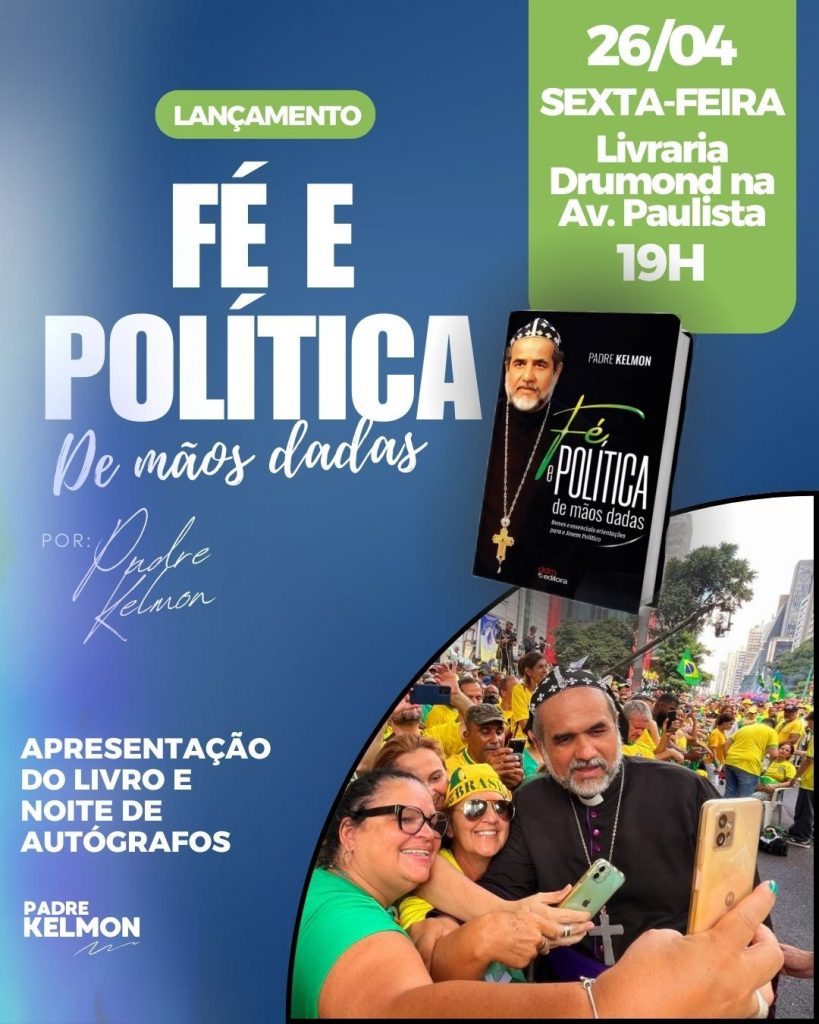 O padre folclórico que apareceu nas eleições de 2022 para a presidência do PTB, Padre Kelmon Luís da Silva Souza, está lançando um livro – Fé e política andam de mãos dadas. Será no dia 26 de abril. Kelmon é cotado para ser candidato a prefeito de São Paulo pelo PRD – Partido Renovador Democrático, resultado da fusão entre PTB e Patriota.