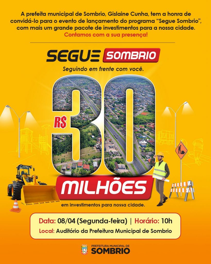 Novo pacote de obras de R$ 30 milhões será anunciado na segunda-feira (8), às 10 horas, no Auditório da Prefeitura de Sombrio pela prefeita Gislaine Cunha (MDB).