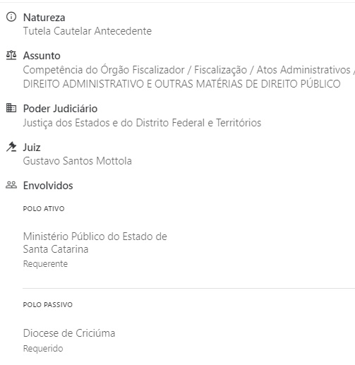 No polo passivo, portanto, a Diocese de Criciúma, que detém o poder sobre o Santuário Nossa Senhora Mãe dos Homens, onde está edificada da igreja.
