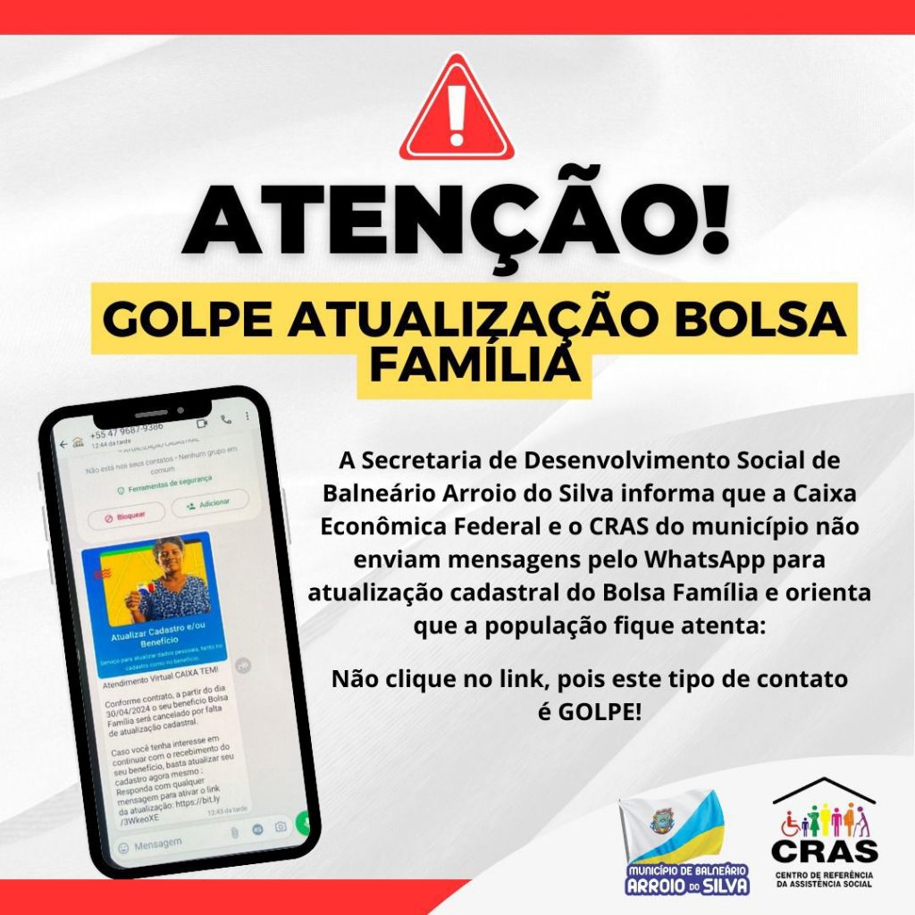 A Secretaria Municipal de Desenvolvimento Social de Balneário Arroio do Silva emitiu um alerta à população sobre mensagens fraudulentas circulando pelo WhatsApp relacionadas à atualização cadastral do programa Bolsa Família. Conforme relatos, alguns usuários têm recebido mensagens supostamente originadas do CAIXA TEM, informando sobre o término do contrato e solicitando que cliquem em um link para atualizar seus cadastros, a fim de evitar a perda do benefício do Bolsa Família.