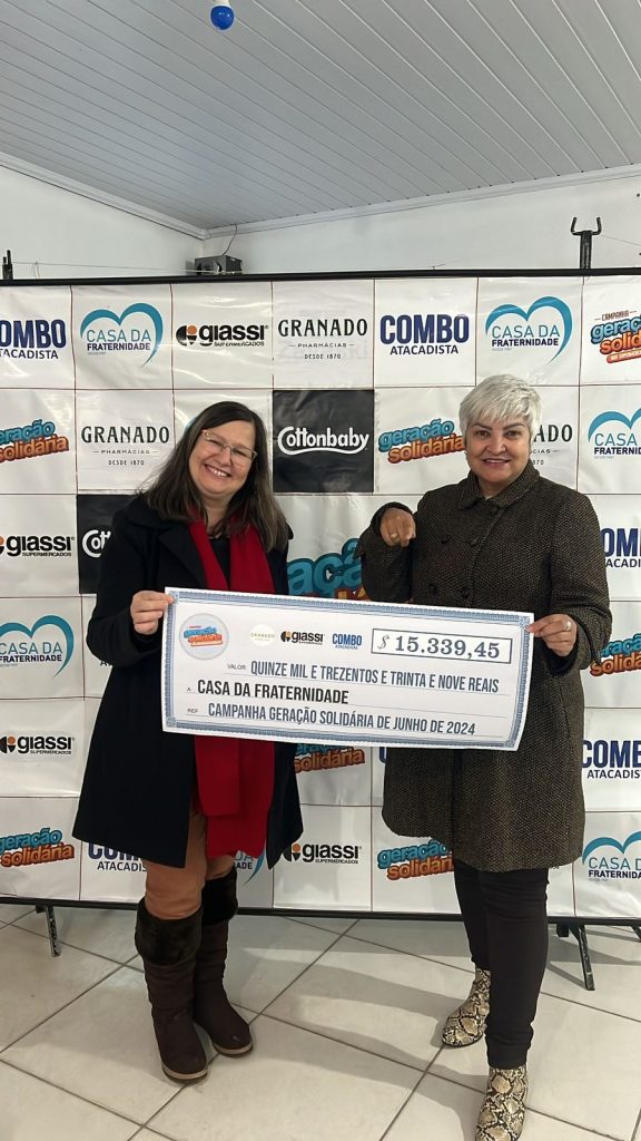 Durante todo o mês de Junho estiveram nos Supermercados Giassi e Combo Atacadista do estado os produtos da empresa Granado, que arrecadou R$ 15.339,45 reais para a Casa da Fraternidade. A entrega do cheque foi acompanhada pela vice-presidente da entidade Ivete Rodrigues e pelo Coral da Instituição que homenageou a todos com uma apresentação.