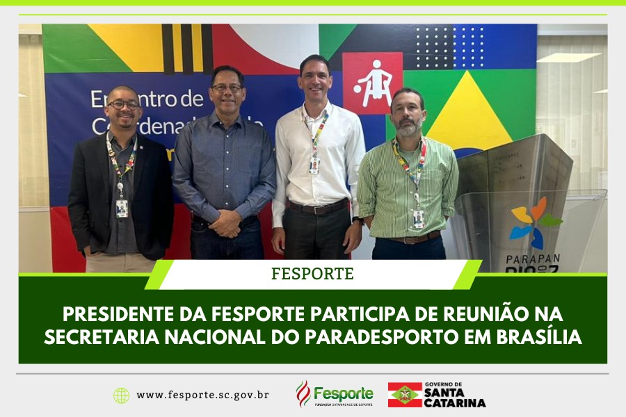 O presidente da Fesporte, Freibergue Nascimento, esteve nesta quinta-feira, 18, na Secretaria Nacional do Paradesporto em Brasília (DF), onde debateu com representantes do órgão medidas que possam ser implantadas no paradesporto de Santa Catarina.