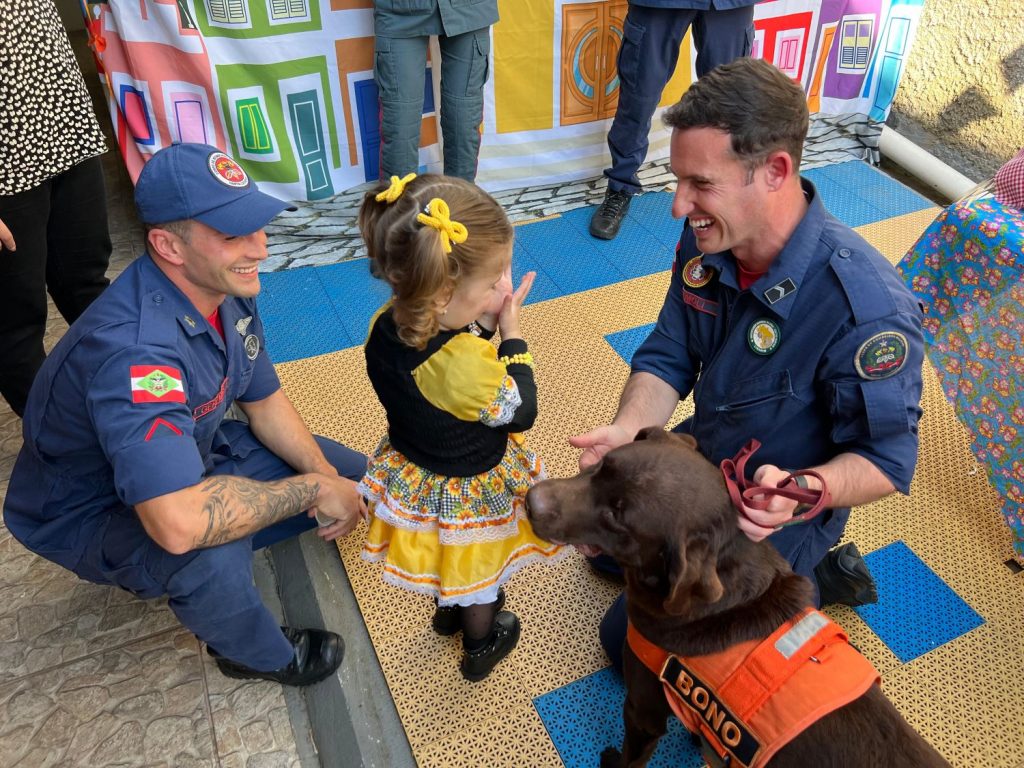 A guarnição de bombeiros militares do 4° Batalhão de Bombeiros Militar de Criciúma e o binômio, composto pelo cabo Matheus Premoli e o cão Bono, visitaram a Casa Guido, uma instituição dedicada ao apoio a crianças e jovens com câncer. O encontro, que ocorreu na tarde de quarta-feira, 23, levou sorrisos e alegria aos pequenos em tratamento.