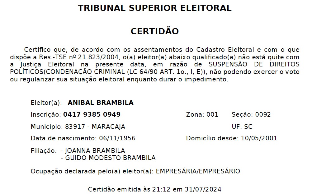Na certidão do Tribunal Superior Eleitoral (TSE) emitida às 21:12 de hoje, 31/07/2024, segue a suspensão dos direitos políticos do prefeito de Maracajá Aníbal Brambila (PSD). Faltam 5 dias para as convenções e a suspensão não foi derrubada pelo escritório de advocacia do ex ministro Admar Gonzaga.