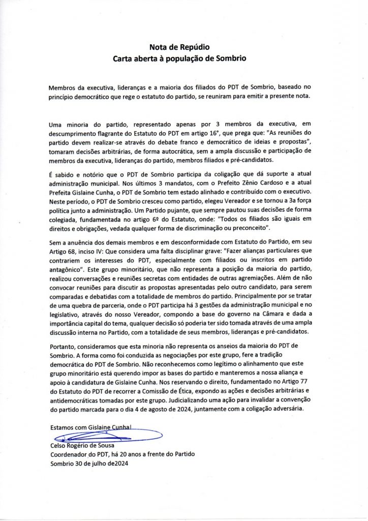 O ex vereador Celso Rogério de Souza perdeu o comando do PDT, que em 2020 estava com a prefeita Gislaine da Cunha (MDB), mas que agora irá apoiar Peri Soares (PP). Inconformado, Celsinho divulgou uma nota de repúdio, que não terá o condão de mudar a decisão do PDT, já que o deputado estadual Rodrigo Minotto, presidente da sigla, avalisou o acordo.