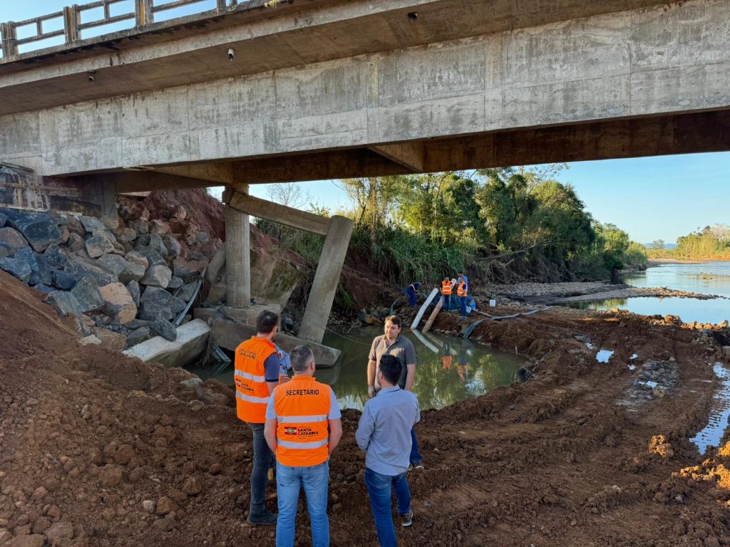 O secretário de Estado da Infraestrutura e Mobilidade, Jerry Comper, vistoriou nesta quarta-feira, 31, as obras na ponte do Rio Canoas, que liga o município de Praia Grande a São João do Sul. A estrutura ficou danificada por conta das fortes chuvas, ocasionando deslocamento de um pilar e de uma viga da ponte.
