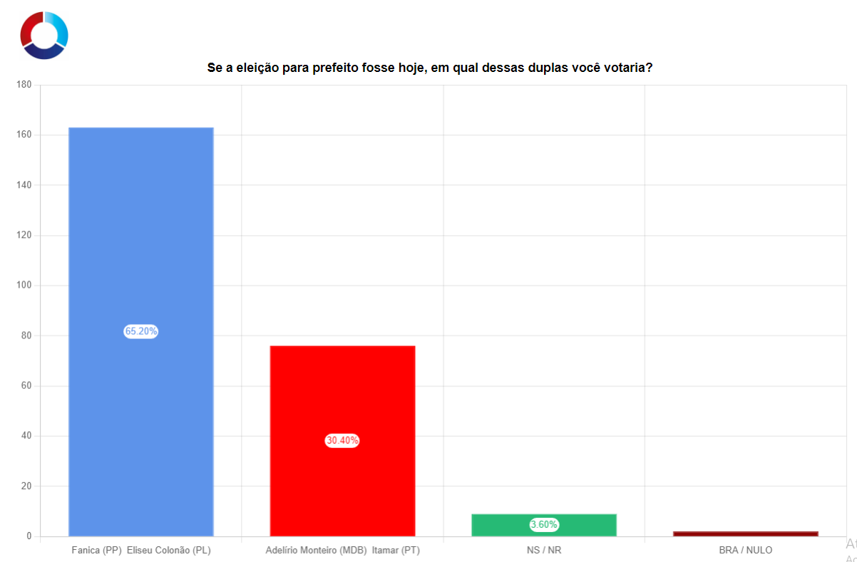 Fanica lidera com 65,20% das intenções de voto contra 30,40% de Adelírio (MDB), uma diferença de 34,8%.