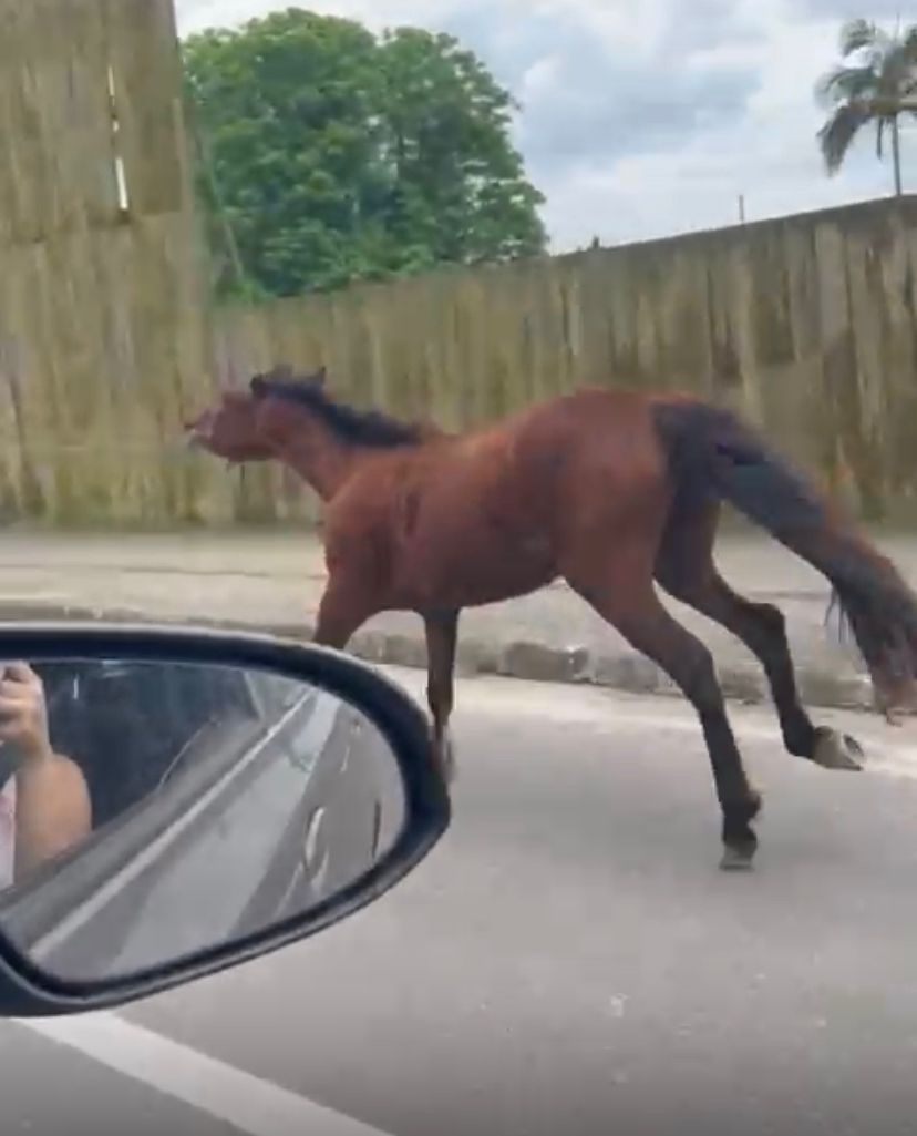Um cavalo amarrado sendo arrastado por um carro enquanto trafegava pela Avenida Getúlio Vargas.