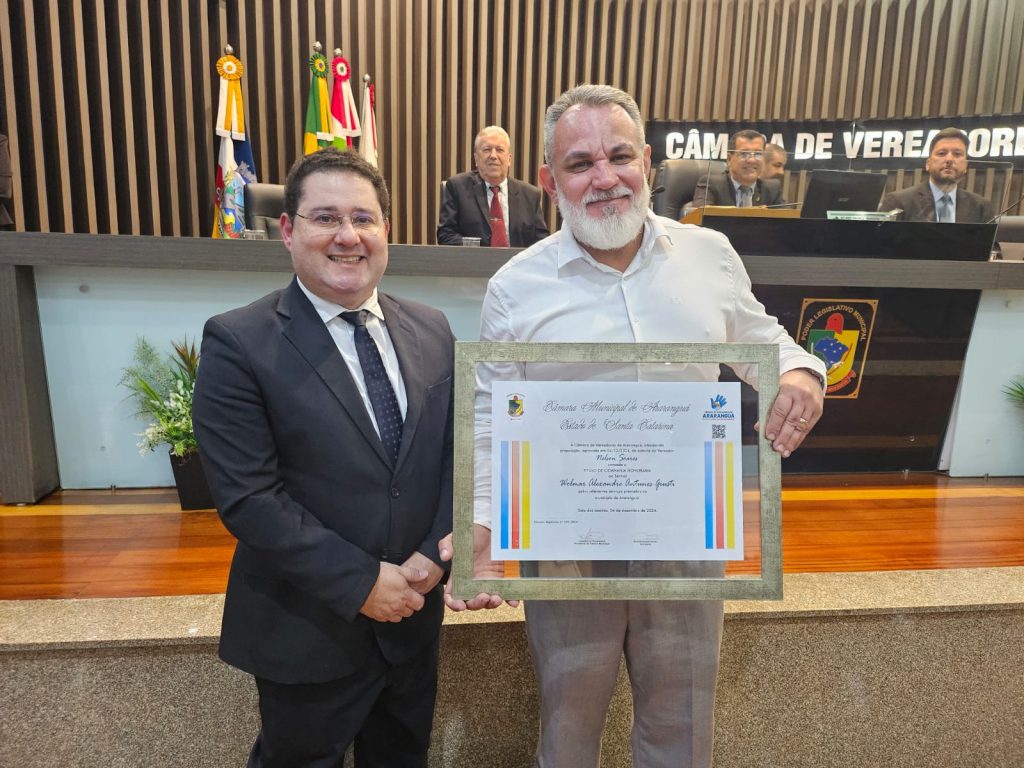 Durante a sessão de quarta, 05, na Câmara Municipal, o presidente da subseção da OAB de Araranguá, Wolmar Giusti, que está em seu terceiro mandato, recebeu a cidadania honorária.