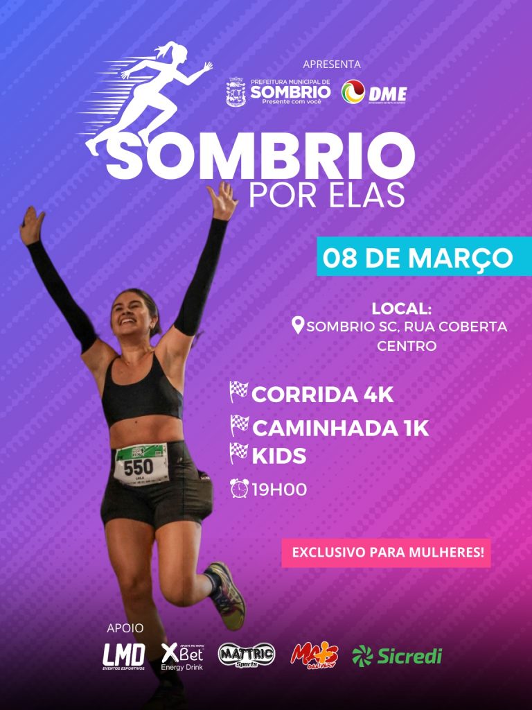 A Prefeitura Municipal de Sombrio realizará no dia 8 de março a 1ª Corrida “Sombrio por Elas, um evento idealizado pela prefeita Gislaine Cunha, entusiasta e participante assídua de corridas. As inscrições foram encerradas, contabilizando mais de 600 mulheres inscritas.
