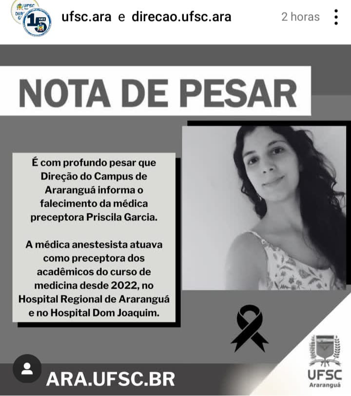 É com profundo pesar que a Direção do Campus Araranguá informa o falecimento da médica preceptora Priscila Garcia.