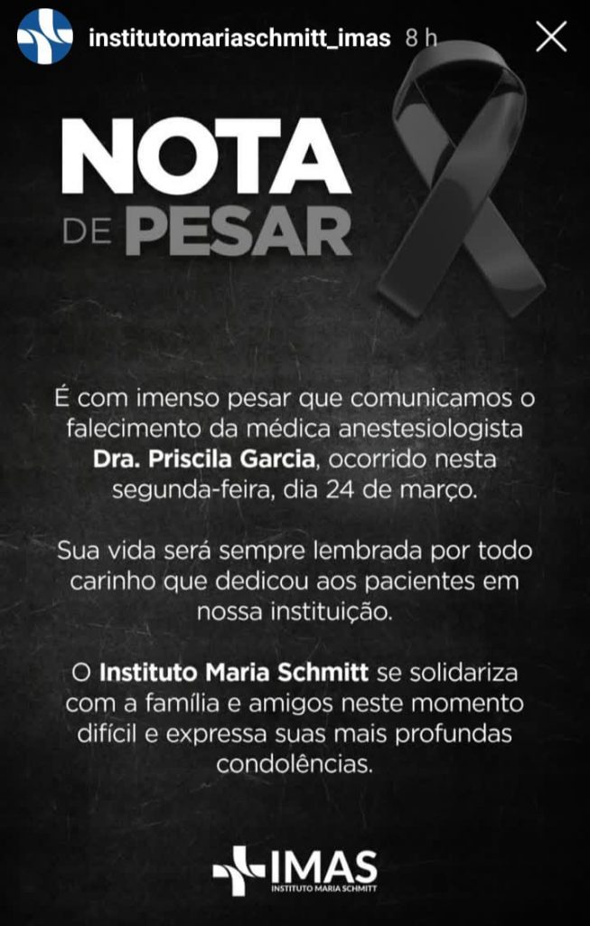Nas redes sociais, o IMAS manifestou profundo pesar pela perda da profissional, destacando sua dedicação e compromisso com a medicina.