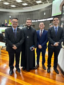 O pároco da Paróquia Sagrada Família, no bairro Cidade Alta, padre Mateus Réus, ocupou a tribuna da Câmara de Vereadores de Araranguá na noite desta segunda-feira (16), a convite dos vereadores Douglas Michels, Júnior Bailão e Joel Casagrande. A participação atendeu ao Requerimento 102/2025 e teve como objetivo divulgar oficialmente