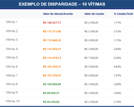 Foram identificadas, até o momento, 215 vítimas, com estimativas de mais de mil pessoas lesadas em diferentes regiões do Brasil. As vítimas assinavam contratos sem total entendimento, e em alguns casos, enquanto o crédito judicial chegava a R$ 146 mil, os idosos recebiam apenas R$ 2,5 mil.