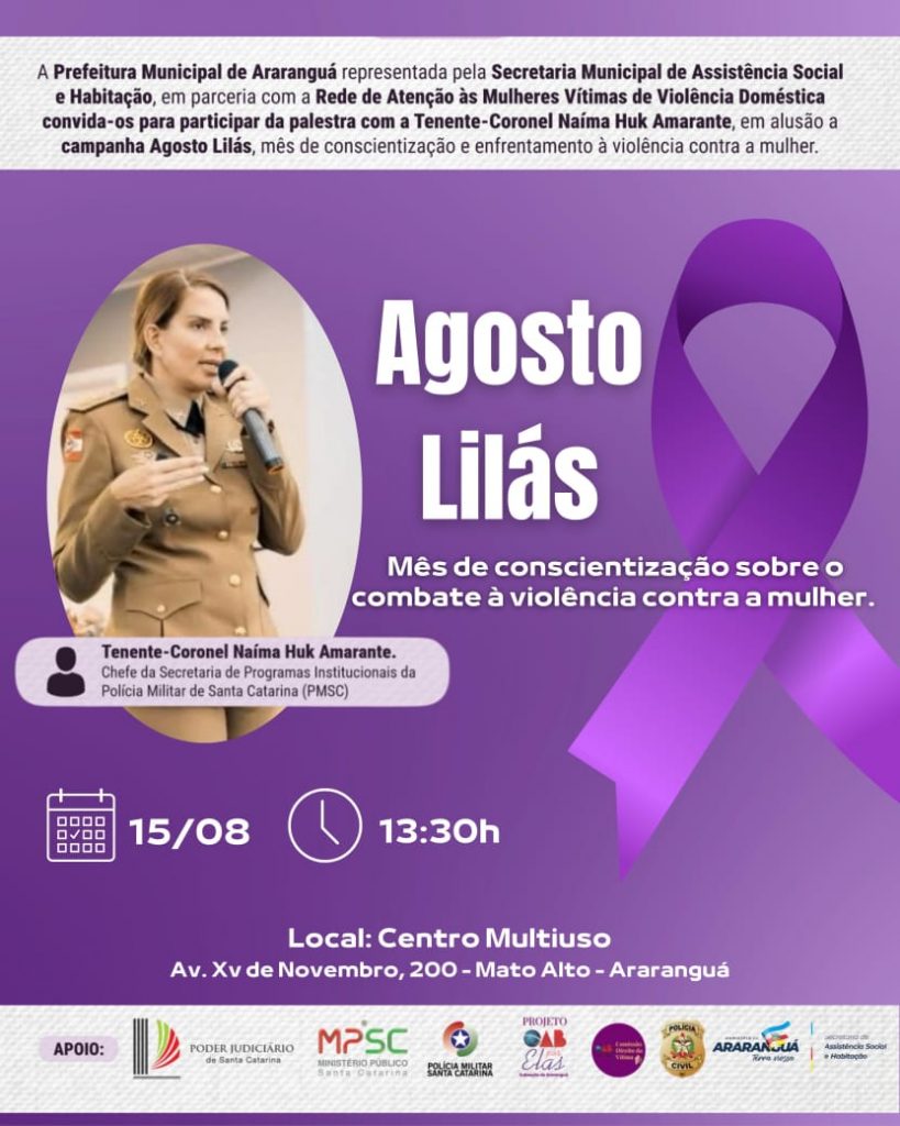 A Prefeitura de Araranguá, por meio da Secretaria de Assistência Social e em parceria com a Rede de Atenção às Mulheres Vítimas de Violência Doméstica, promove no dia 15 de agosto, às 13h30, um encontro especial em homenagem ao Agosto Lilás — campanha nacional de enfrentamento à violência contra a mulher.