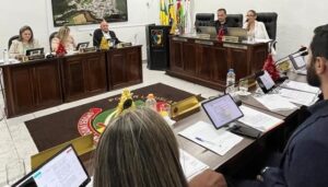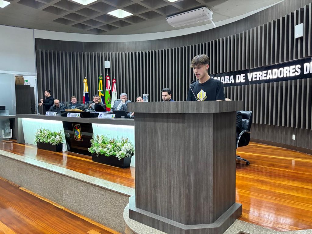 Durante a sessão da Câmara de Vereadores de Araranguá, realizada na noite de segunda-feira (11), o aluno Luiz Eduardo Nazário Fernandes e o professor Alexandre Zilli da Silva, da Escola de Educação Básica de Araranguá, apresentaram o projeto “Paródias sobre a Sustentabilidade”. O convite foi feito por meio do Requerimento nº 145/2025, de autoria do vereador Joel Casagrande.
