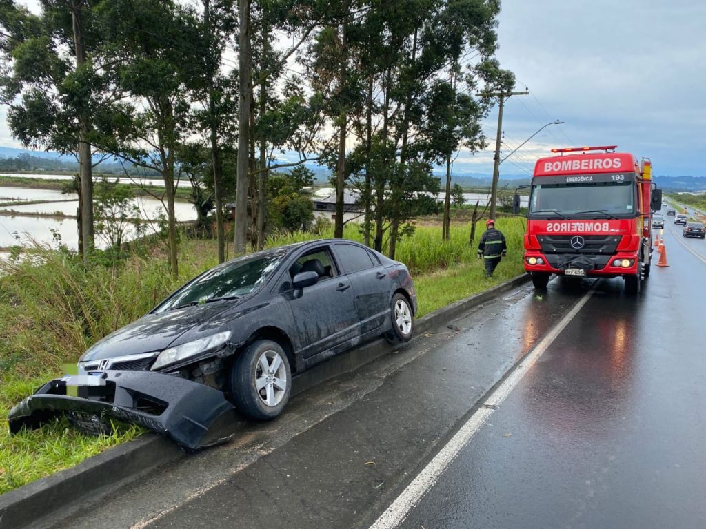 Segundo informações do Corpo de Bombeiros Militar de Morro da Fumaça, o condutor de um Honda Civic, modelo LXS, placas Mercosul, perdeu o controle do veículo e saiu da pista. O carro ficou suspenso pelo meio-fio, sem risco de queda ou de instabilidade na ribanceira.