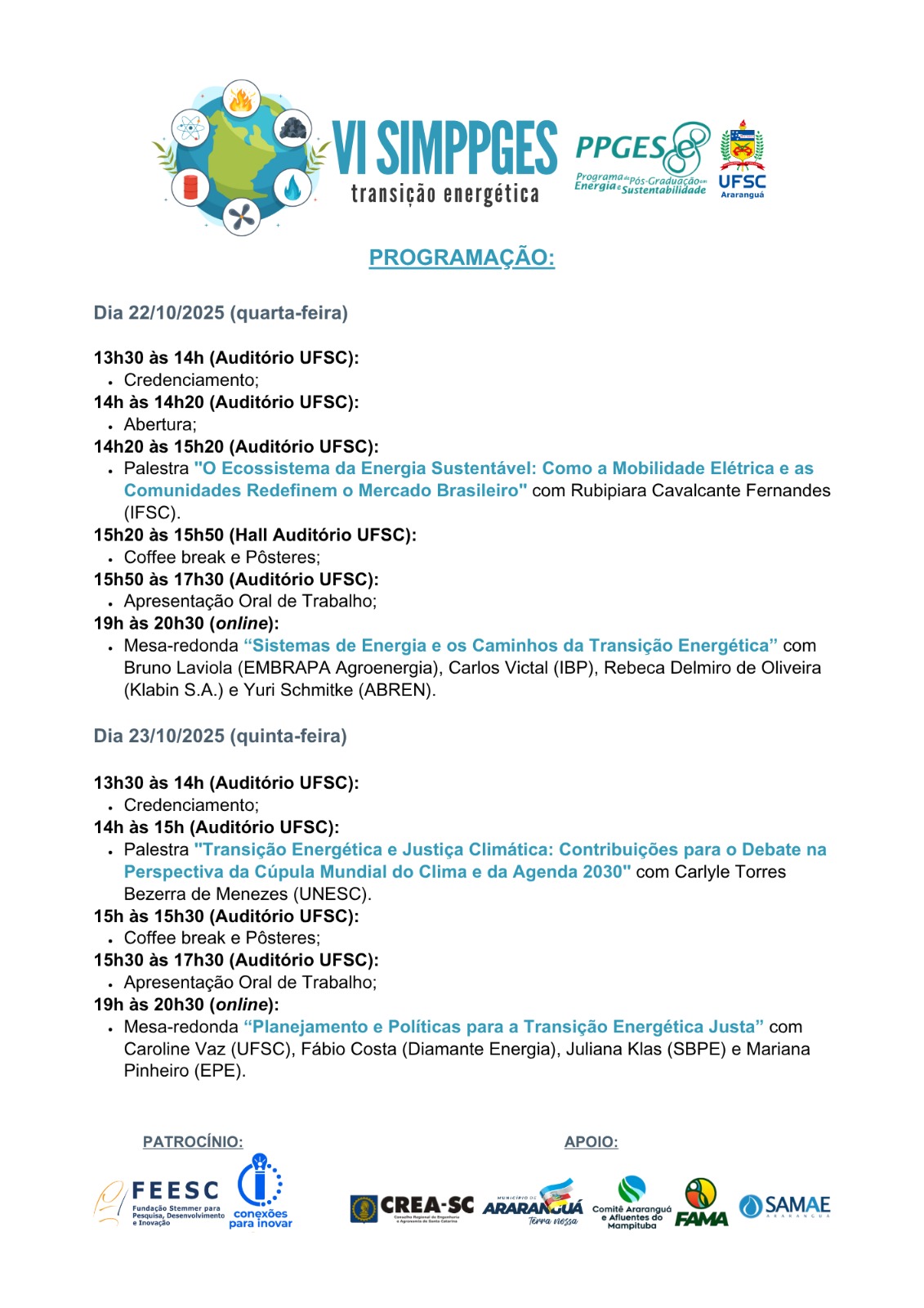 As atividades presenciais acontecem no hall e auditório da UFSC Araranguá, com exposições de pôsteres, palestras e apresentações orais durante a tarde. À noite, a programação segue online, com mesas-redondas sobre a agenda global da transição energética.