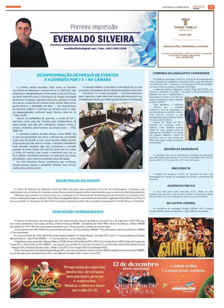 Desapropriação não passou na Câmara; comenda para Cesar; fim de ano no Legislativo; e mais 7 de dezembro de 2025
