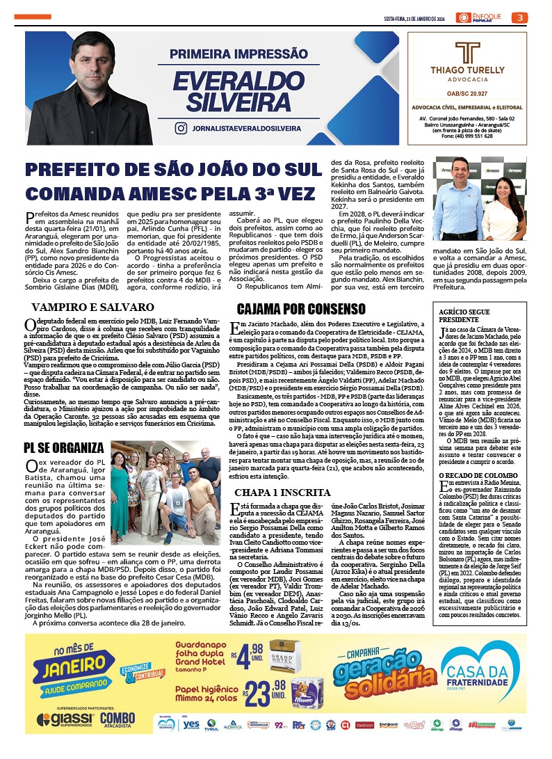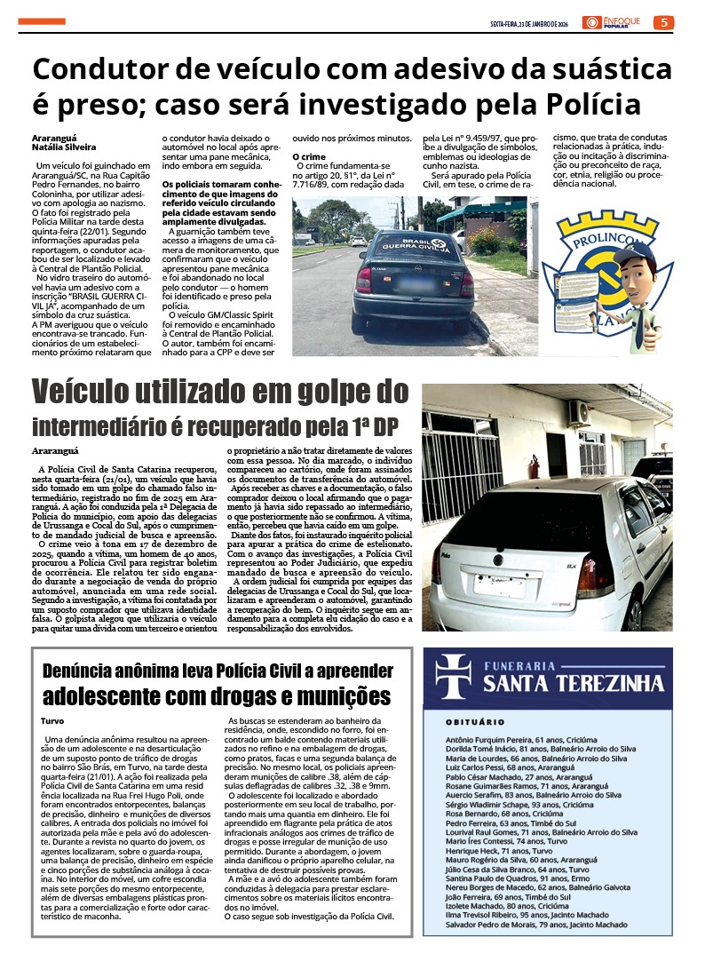 Jornal Enfoque Popular – 2850 – Araranguá: Carro com símbolo nazista é apreendido e condutor acaba preso 23 de janeiro de 2026 Jornal Enfoque Popular 0 Comments More to Explore Jornal Enfoque Popular – 2849 – Alliance one fecha as portas em Araranguá 12 Anos depois: Araranguá terá novo Presídio Regional Comments (0) Deixe um comentário Cancelar respostaO seu endereço de e-mail não será publicado. Campos obrigatórios são marcados com *Nome * E-mail * Site Salvar meus dados neste navegador para a próxima vez que eu comentar. Comentário *