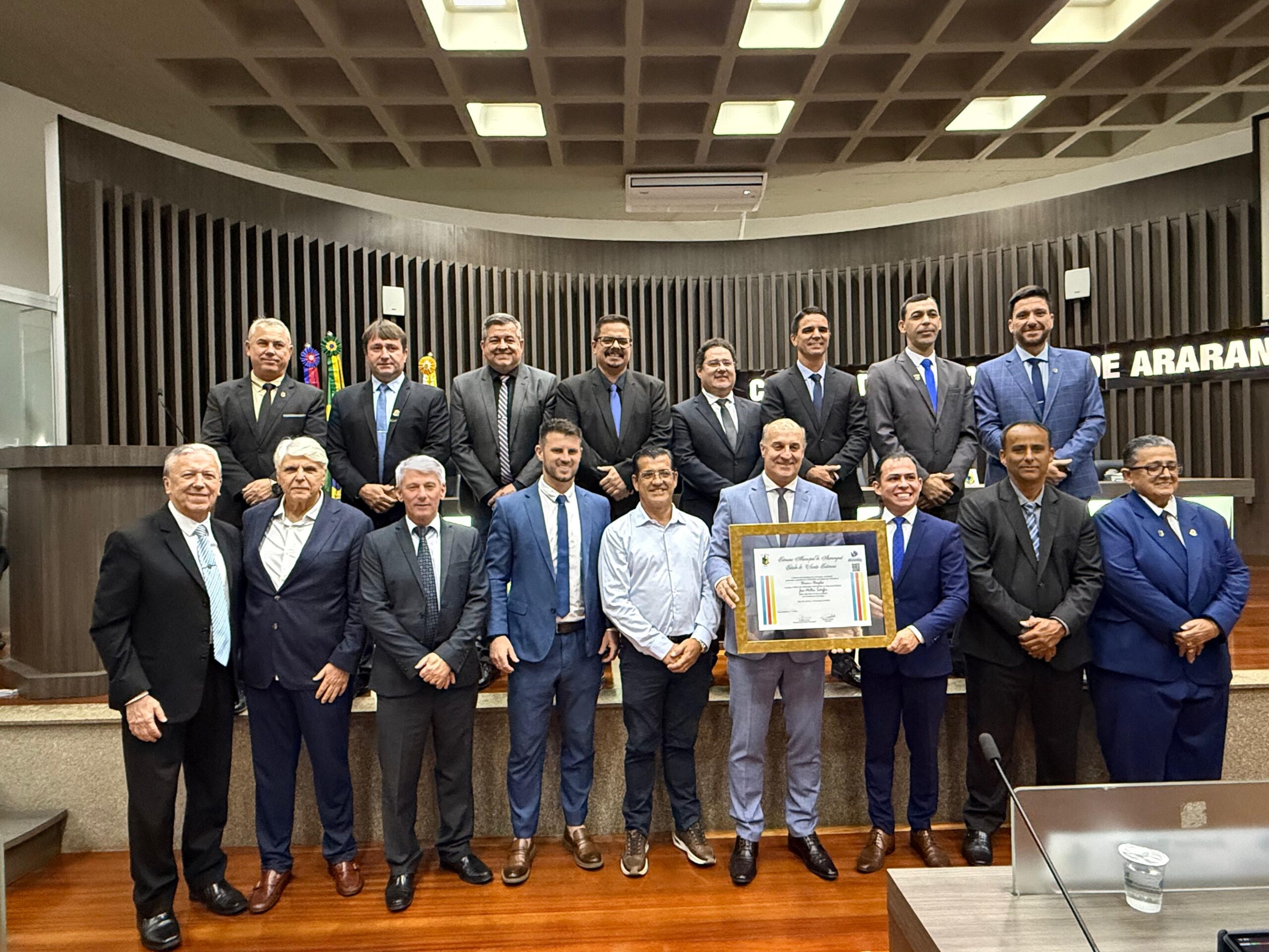 A Câmara de Vereadores de Araranguá concedeu, na noite desta segunda-feira (16), durante a 11ª sessão ordinária de 2026, o Título de Cidadão Honorário Araranguaense ao deputado estadual José Milton Scheffer, em reconhecimento aos relevantes serviços prestados ao município. A honraria foi proposta por meio do Projeto de Decreto Legislativo nº 001/2026, de autoria dos vereadores Douglas Michels, secretário da Mesa Diretora, e Diran Martins, 2º vice-presidente.