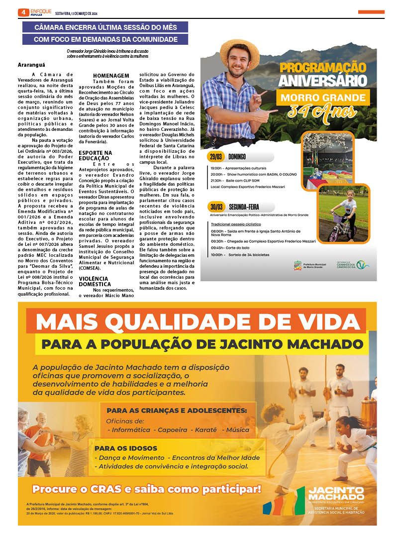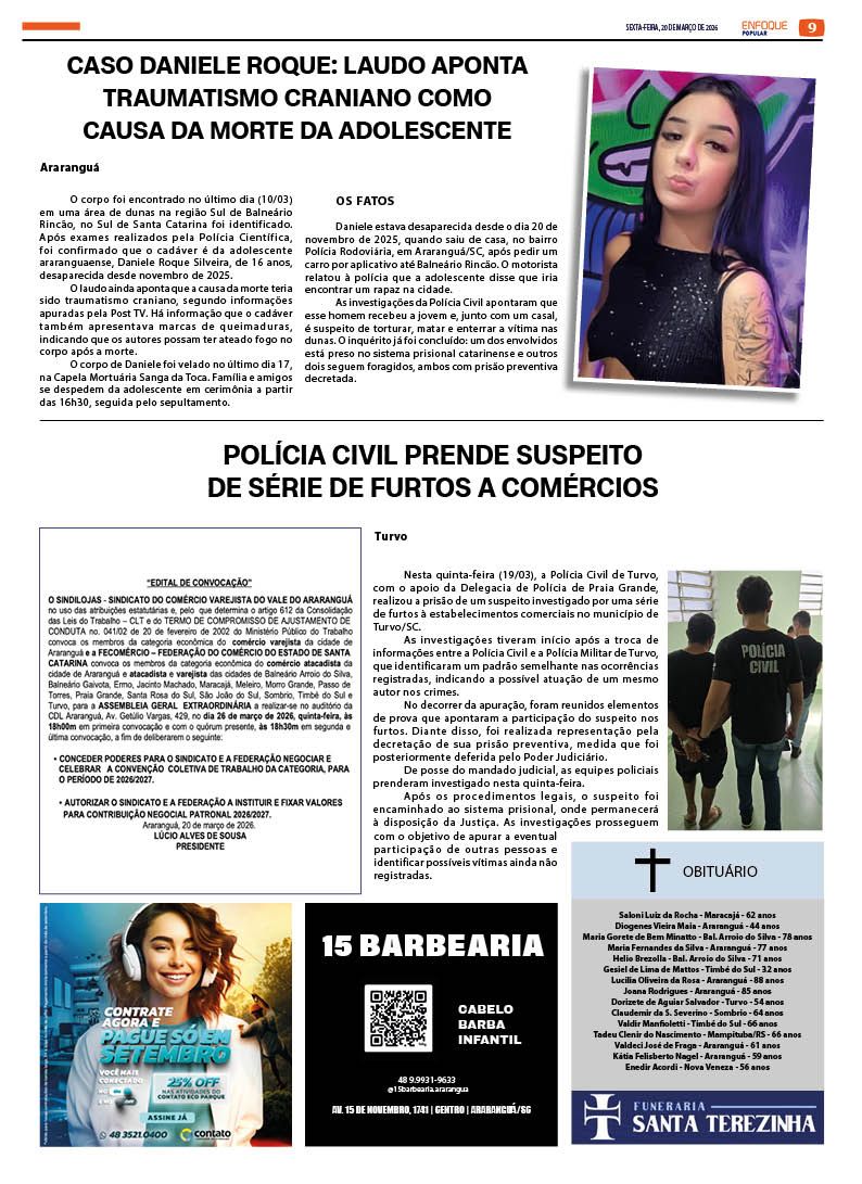 Jornal Enfoque Popular – Edição 2856 – Justiça determina medidas protetivas contra professor denunciado em Araranguá