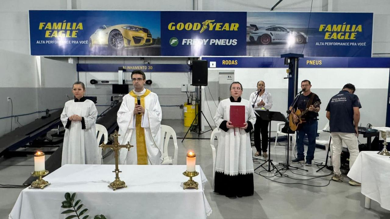 Nesta semana, uma das celebrações foi realizada na quarta-feira (25), na empresa Fredy Pneus, reunindo colaboradores, familiares e fiéis em um momento de oração e reflexão.