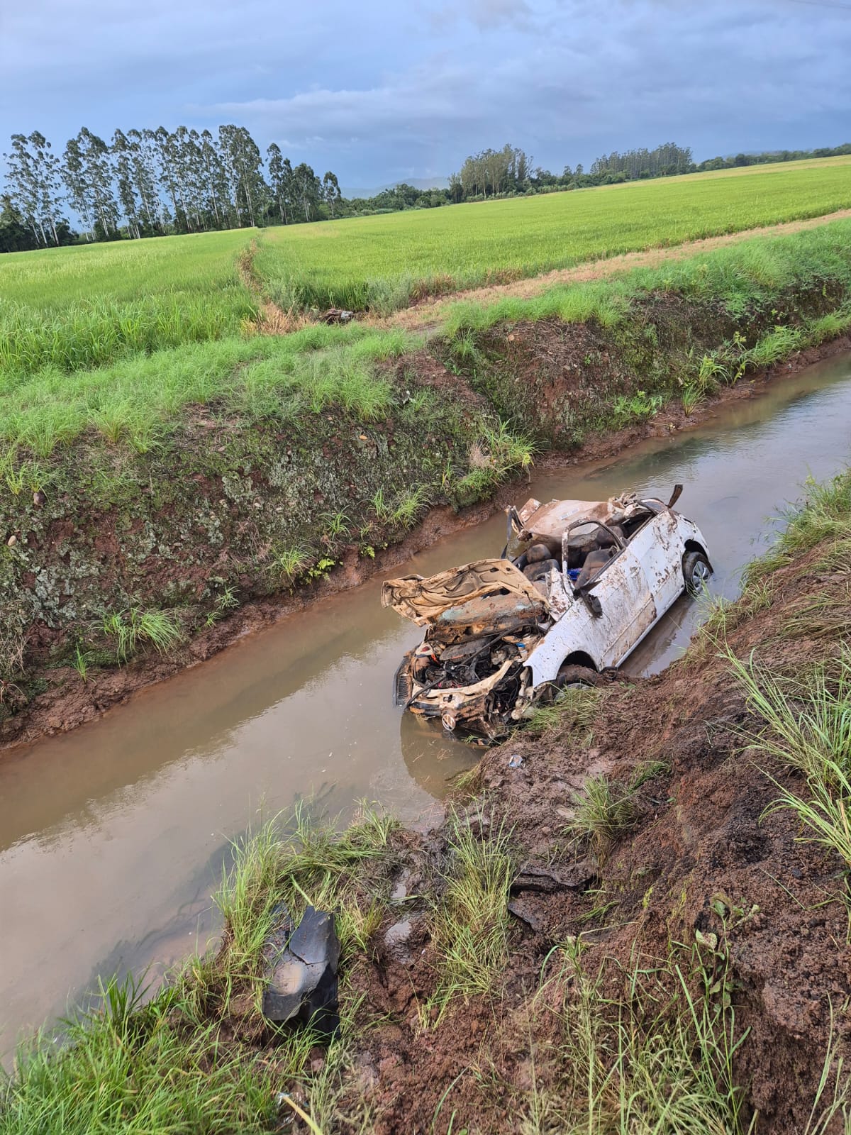 No local, as equipes encontraram um VW Gol que saiu da pista e capotou, parando dentro de um valo com aproximadamente 80 centímetros de água. O veículo teve o teto parcialmente rebaixado, dificultando o resgate.