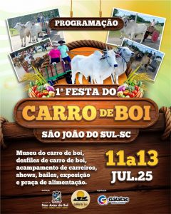 O município de São João do Sul viveu um fim de semana histórico com a realização da 1ª Festa do Carro de Boi, nos dias 11, 12 e 13 de julho. Detentor do título de Capital Catarinense do Carro de Boi e do recorde nacional com 318 veículos desfilando em